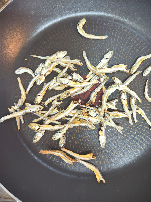냄비에 마른멸치를 살짝 볶아서 잡내를 없애줍니다.