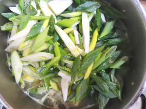 거품을 걷어내고 파, 마늘을 넣습니다.
