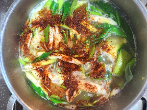 마지막에 고춧가루를 적당량 넣고, 한소끔 더 끓인 뒤 불을 끕니다.