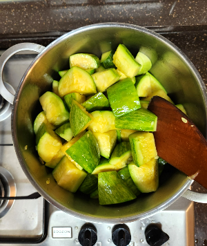 적절한 크기의 냄비에 식용유를 두르고 강불에 호박을 살짝 볶아 줍니다.