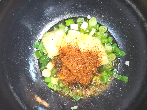 - 프라이팬에 식용유를 넉넉히 두르고, 파, 마늘, 고춧가루를 넣고 저으며 끓입니다.