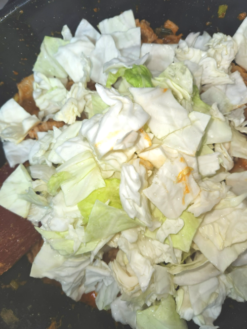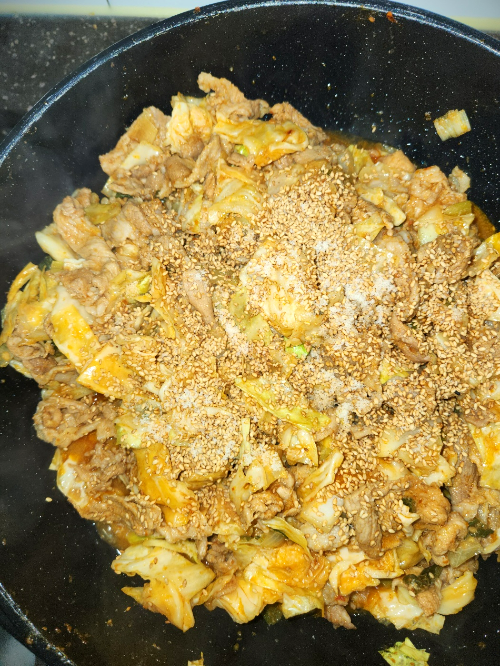 - 고기가 익으면 양파, 양배추 등 야채를 넣고 잘 섞습니다. 간을 보고 소금과 간장을 가감하여 맞춥니다.